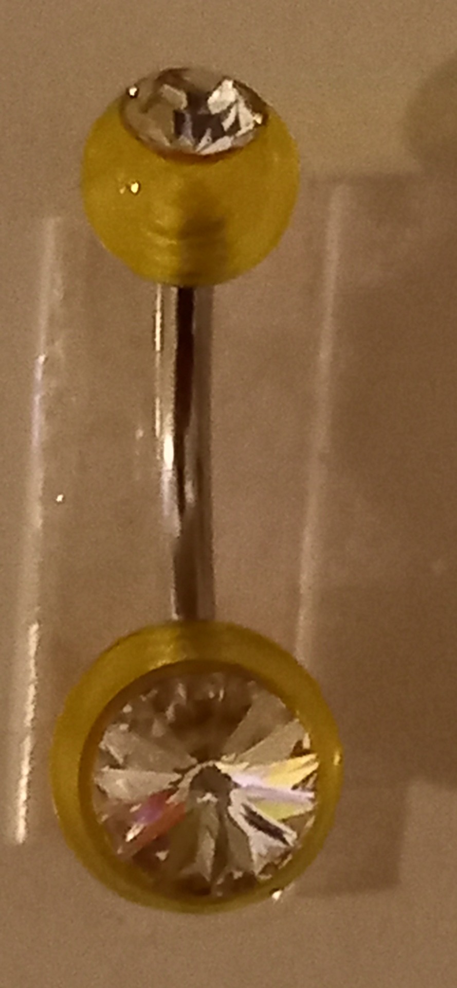 Napakoru. Kirkkaat korukivet kummassakin päässä, väri keltainen. Varren paksuus 1,6mm, varsi titaania, varren pituus n 1 cm. Sopii aloituskoruksi.