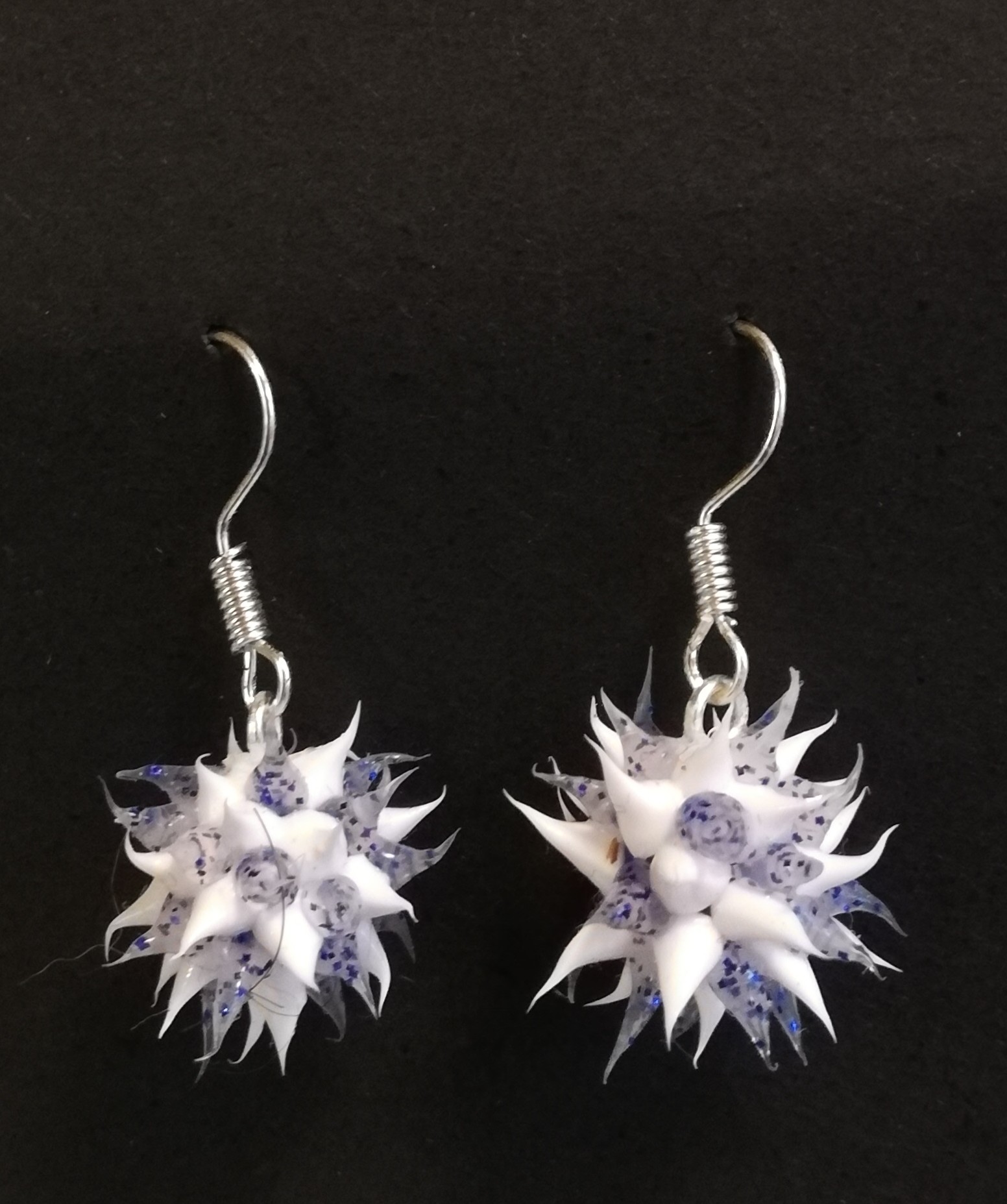 Hauskat pörrö-korvakorut. Väri vaaleansininen ja valkoinen. Koukut kirurginterästä.