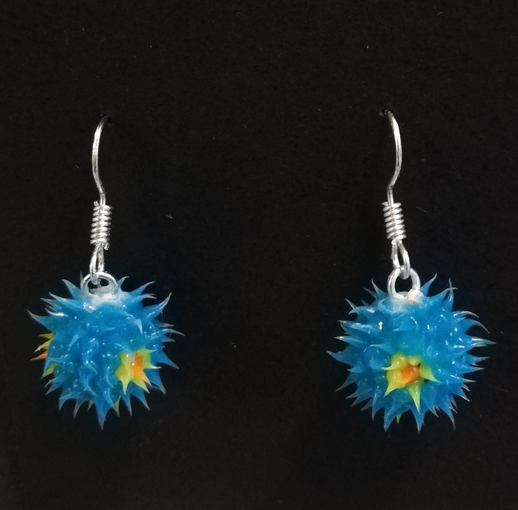 Hauskat pörrö-korvakorut. Väri sininen, jossa keltaisia kukkia. Koukut kirurginterästä.